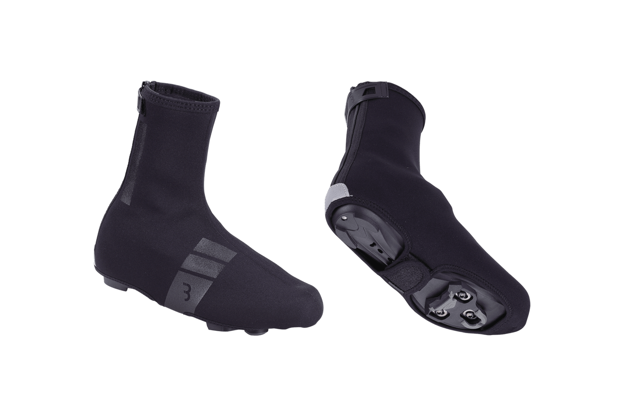 Überschuhe gibt es als Wind- und Regenschutz wie die Bike Gamaschen von Vaude (24 Euro) oder als besser isolierende Variante aus Neopren wie den Heavy Duty OSS von BBB (32,95 Euro). Gerade für längere Touren bieten sich letztere an. Im Alltag muss man etwas aufpassen, denn die meisten Überschuhe umfassen die Fußspitze und haben einen Riemen, der unterhalb der Sohle verläuft – häufiges Gehen mit Überschuhen schadet dem Material.