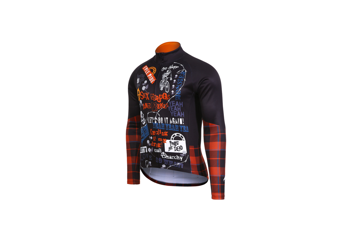 Fahrradtrikots für Herbst und Winter gibt es in vielen Farben und Formen. Für Sportler*innen wichtig, aber auch auf Touren praktisch: Die Rückentaschen für Werkzeug, Telefon und Energieriegel. Wem herkömmliche Designs zu öde sind, findet durchaus Abwechslung: zum Beispiel die Langarm-Trikots New Rose (Frauen) und Rude Boy (Männer) im Punk-Stil von Protective aus recyceltem Polyester (79,95 bis 89,95 Euro).